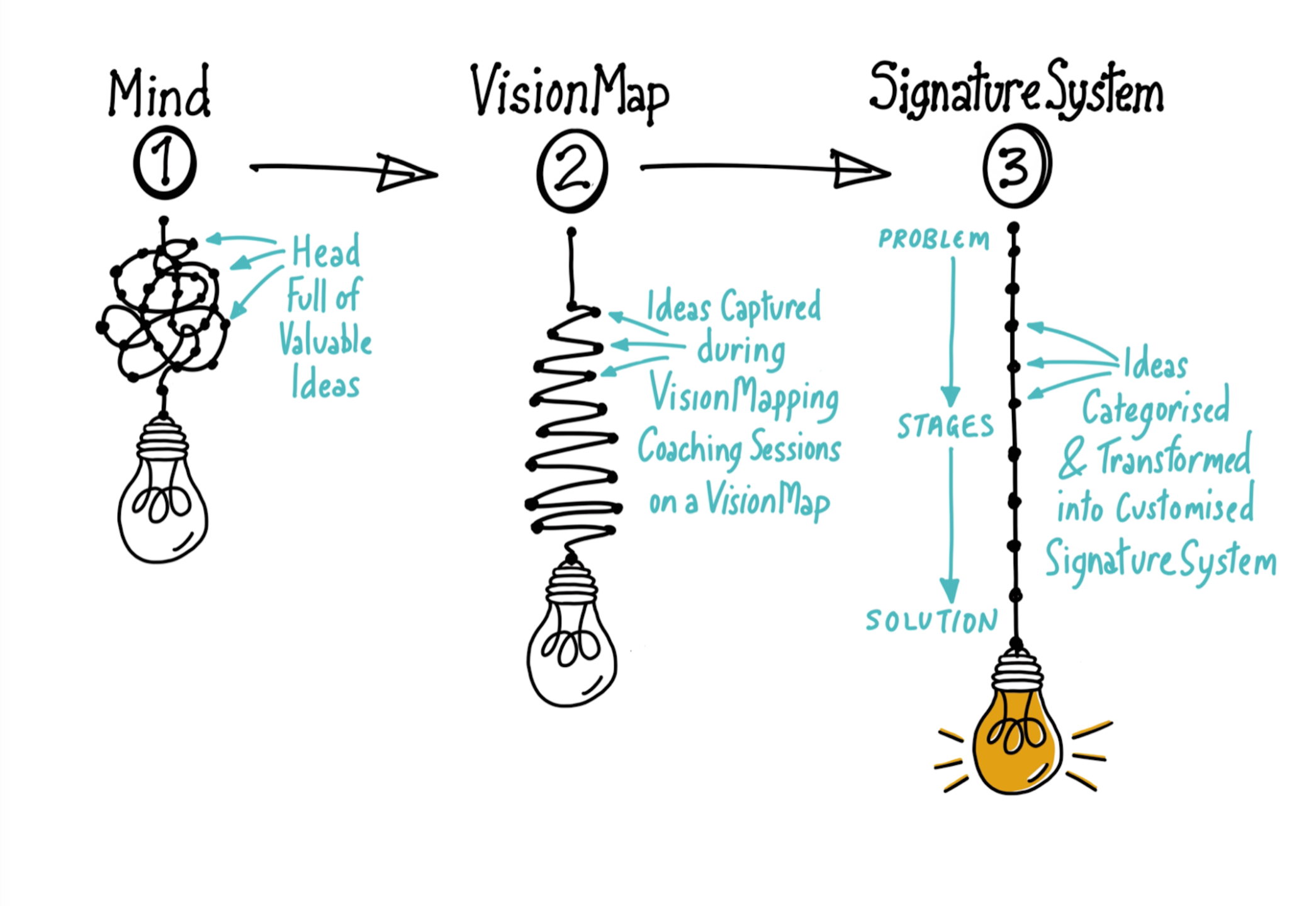 đ It all begins with a VisionMap⢠- a visual mind-map that captures your thoughts, ideas, obstacles and opportunities.
