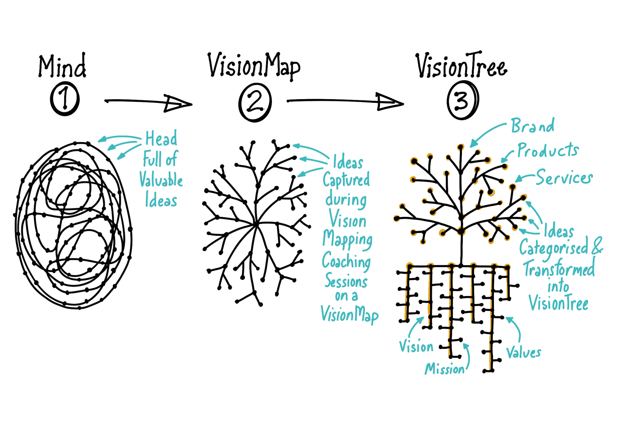 During VisionMapping⢠sessions your ideas are captured, curated and categorised live as we co-create your VisionTreeâ˘Â which helps you: